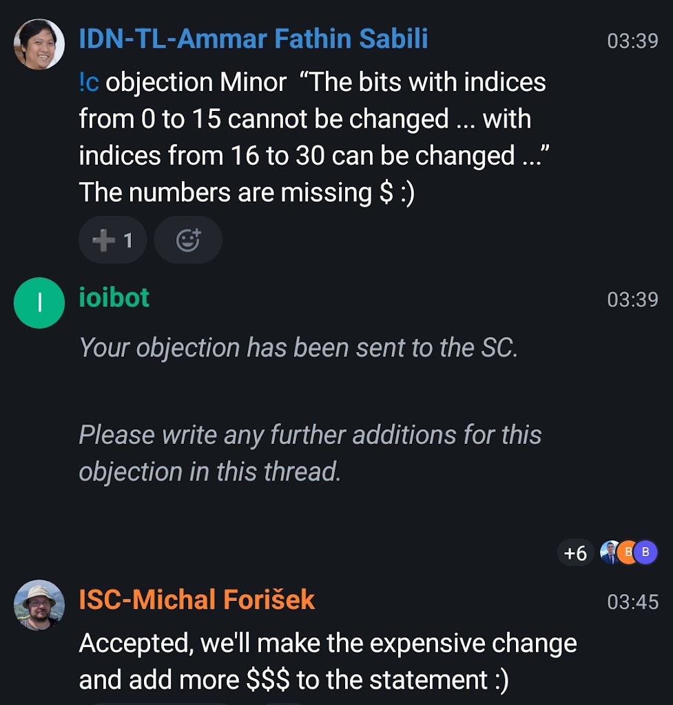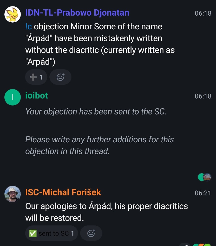 The task selection process is roughly as follows. The tasks are made available through the translation system, which can be accessed by each country after obtaining its credentials through the IOI bot. Leaders then read the tasks and can raise objections to the tasks. There are two kinds of objections: major objections and minor objections. Minor objections usually concerns of correcting typos, rewording, making statements clearer, etc. Major objections are those that can alter the problemset (e.g. rejecting a problem because similar problems appeared elsewhere). All these objections are made through the IOI matrix chat. If there are no more objections after a while, a vote is then cast to accept the problemset, and we can finish the translation afterwards.