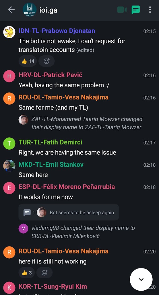 Discussions during the GA are also happening in the IOI matrix chat. After being briefed on the task selection process, we were then asked to obtain our credentials for the translation system through the IOI bot. However, the bot was still not awake. Written credentials were then distributed.
