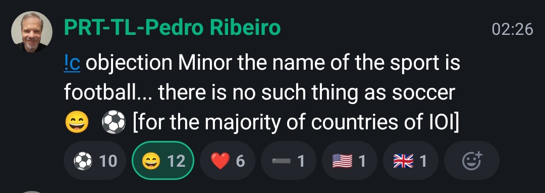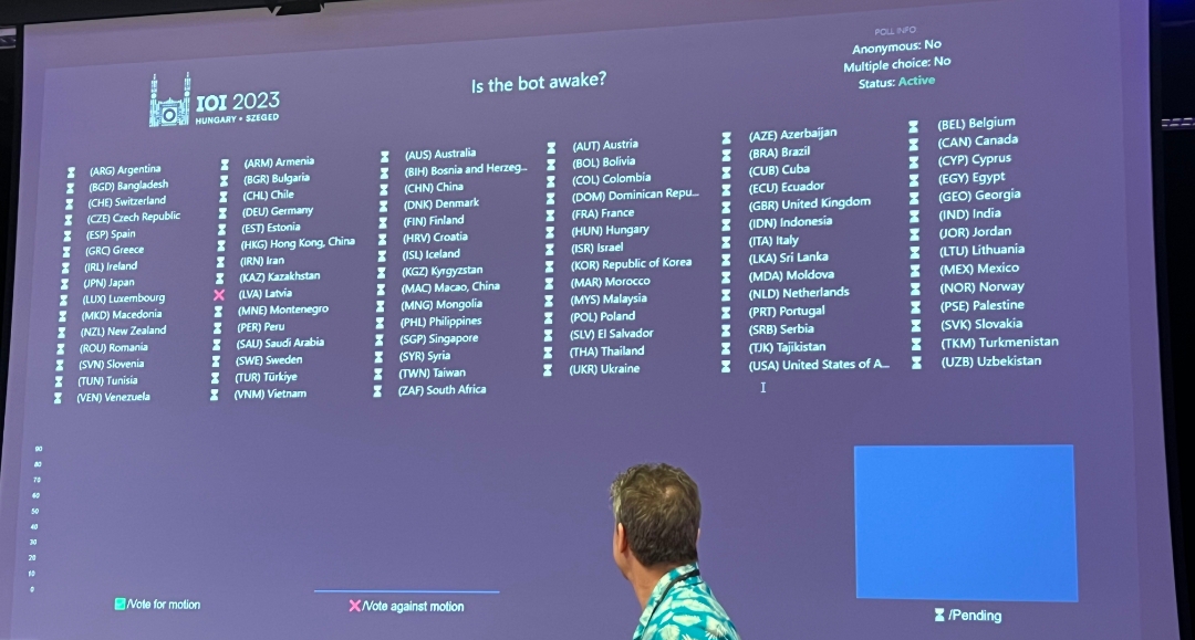 The use of the IOI bot during the online IOI continues to be used for this full onsite IOI. The IOI bot usually helps in administrative tasks involving the GA, mainly for taking votes. However, the bot was not awake this morning, so the votes for this GA use the traditional “raising the country placard”.