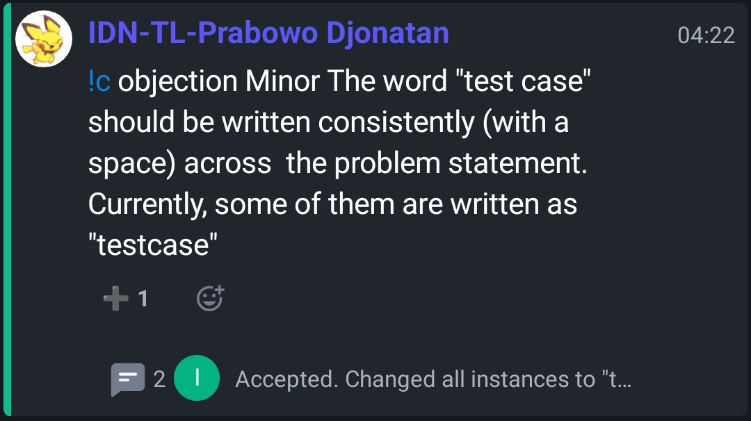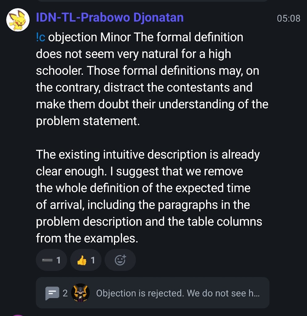 The GA was going to select the task for day 2 contest. The tasks were revealed, and I saw my problem being part of the set. The team congratulated me, and Irvin also immediately realised which one is mine since he already understood my problem taste very well. Not long after, there was a major objection for Hiereoglaph which was quickly dismissed. Another major objection then came, saying that the task was similar to an AtCoder problem. A long discussion was then held to determine whether the task should be kept or to see the backup task. A vote was held, and the decision was to keep the task.