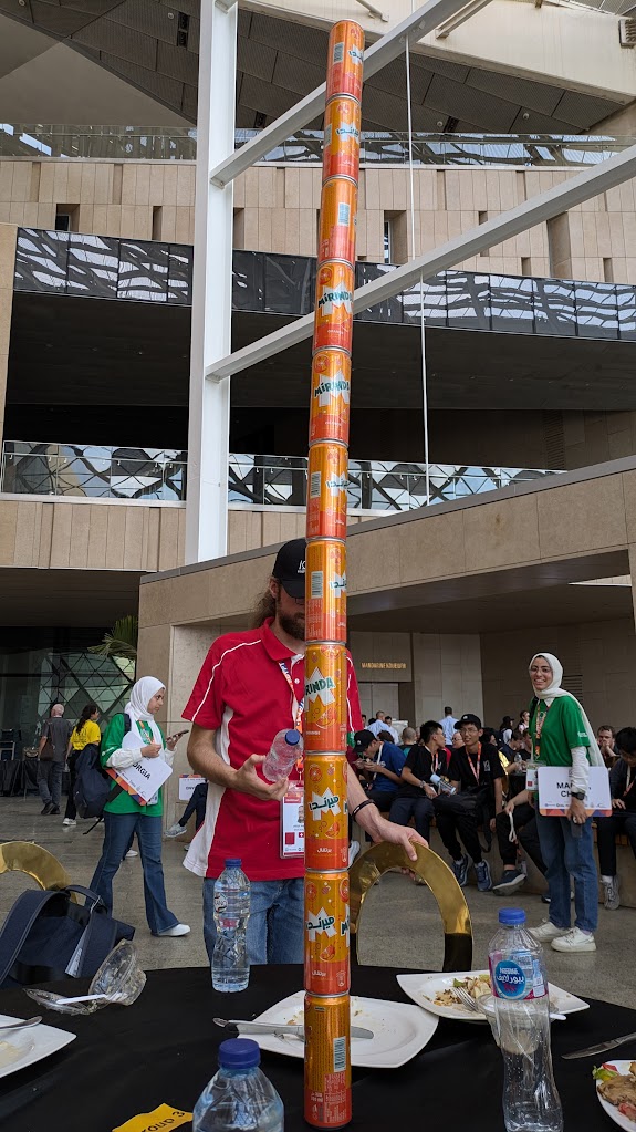 The lunch was also held in the same area. The Indonesian team sat at a round table with the New Zealand team, and they talked about how long the trip was to get to Egypt. After lunch, there really was nothing else to do, and we were simply stuck in the lunch hall. People then started to build towers of cans to kill the time.