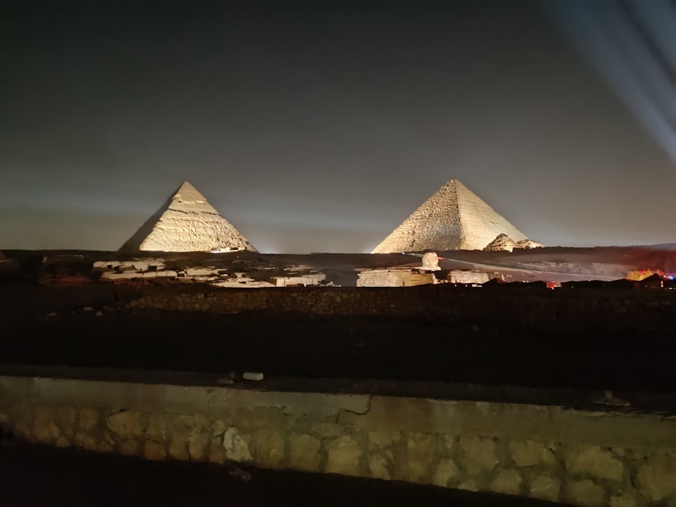 The pyramid and Sphinx at night.