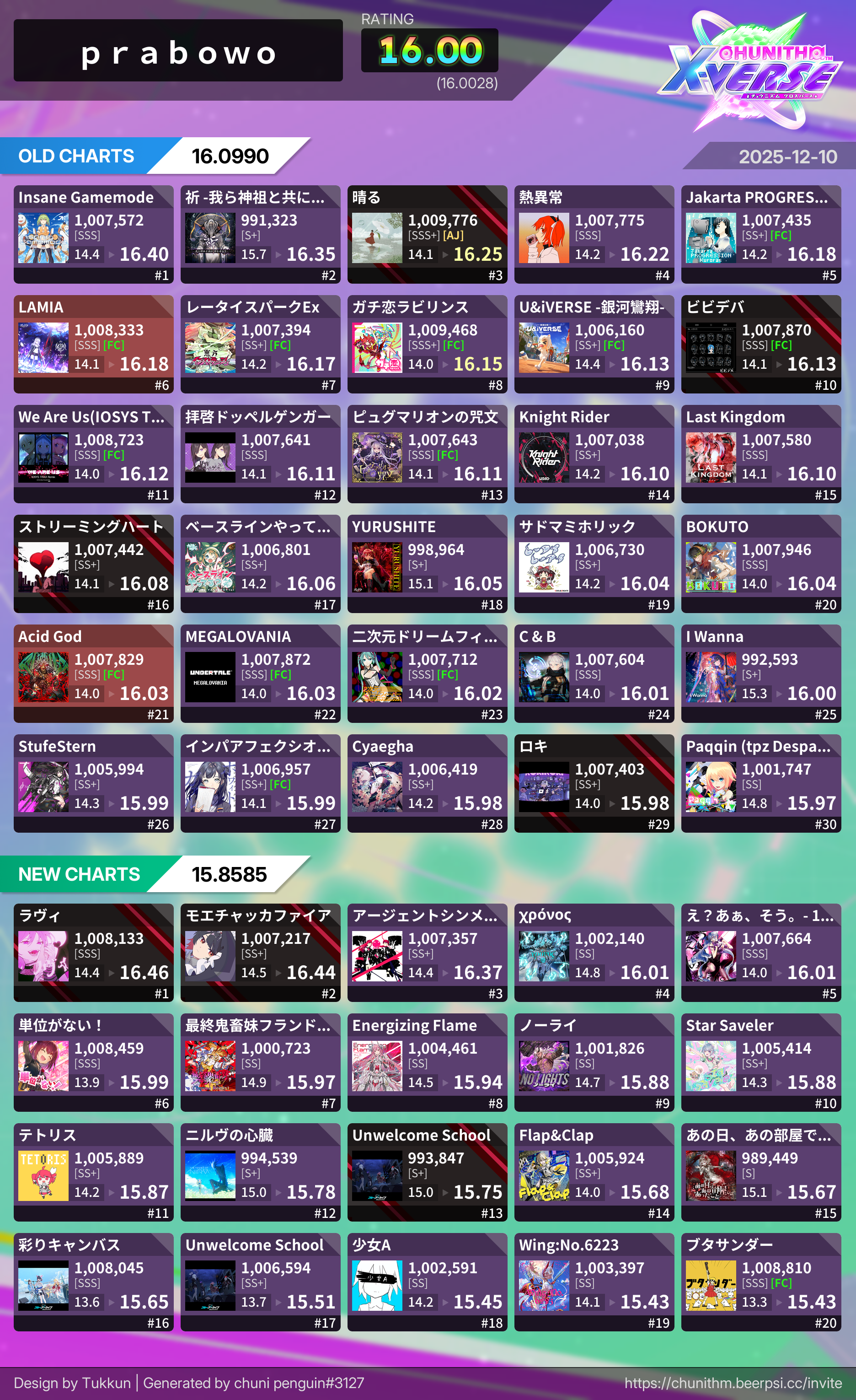 Back in 2014, I started Competitive Programming, and I reached Codeforces Grandmaster after about 6 years. In 2022, I started Chunithm and reached 16.00 after ~3 years (1300-ish play counts). I never had a target for these two games (well, I did, but only when I was already near the milestones), and only competing/playing as my hobbies. Those ranks are admittedly still very far from the pinnacle of each field, but I do take pride on achieving them. Contrary to what people may think about me, I am not really a competitive person, nor am I an achiever.