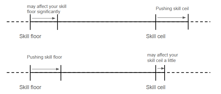 Both skill floor and ceiling are not independent. Pushing one may affect the other, but I do believe pushing skill ceiling is more effective for overall improvement.